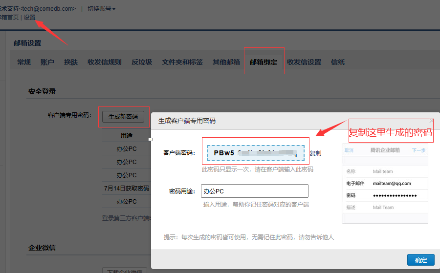 部门邮箱客户端使用方法:需要先生成客户端专用密码才能设置部门邮件客户端,生成客户端密码的方法如下图:网页版--> 【设置】-->【邮箱绑定】 -->【安全登录】 -->【生成新密码】。新生成的密码在停用之前长期有效,密码只显示一次,如果没有复制生成的密码可以重新生成,多个密码可以共存。如果生成的密码的不用了,建议停用。