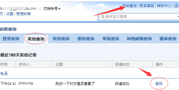 A:24小时之内发错的邮件都可以撤回,撤回方法:网页版-->右上角【自助查询】-->【发信查询】-->【撤回】或者已发送文件夹找到这封邮件,点开邮箱后,点撤回。可撤回的邮件包括发向公司内部的邮件、QQ邮箱、腾讯企业邮箱。
