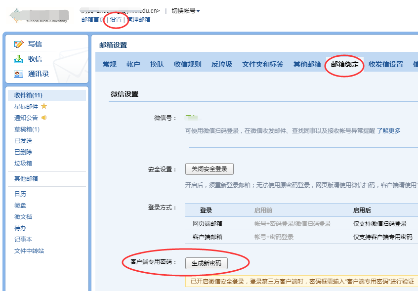 A:新版职工邮箱提供一种登录安全验证机制,邮箱网页版登录时,账号密码验证后还需要微信或企业微信扫码二次确认,也就是说即使邮箱密码让盗邮箱也不会被盗。客户端软件需要使用客户端专用密码。设置客户端专用密码的方法:网页版-->【设置】-->【邮箱绑定】-->【客户端专用密码】-->【生成新密码】。系统如果检测到邮箱帐号不安全会自动开启安全登录功能。