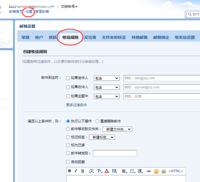 A:腾讯邮箱可以通过设置收信规则实现把特定用户发来的邮件专门存放到特定的文件夹。具体的操作如下:网页版-->【设置】-->【收信规则】。