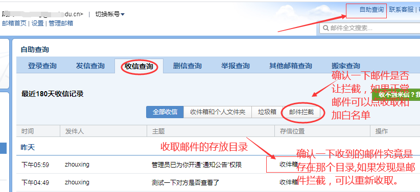 A:如果对方真的发了邮件,一般来说都是能收到邮件的,可能是因为其它原因造成自己没有看到邮件。怎么确认是否真的收到对方邮件呢? 网页版右上角-->【自助查询】-->【收信查询】。