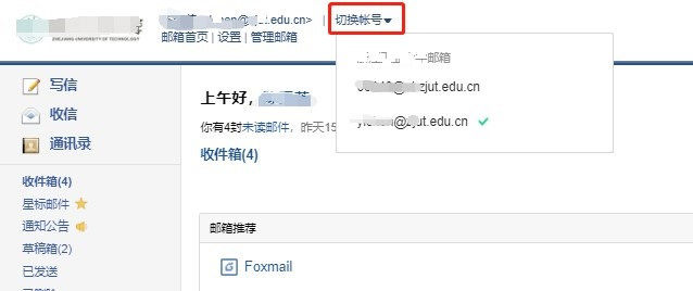 网页版登录方式:出于安全性考虑,部门邮箱关联至部门邮箱管理员的个人邮箱中。邮箱管理员需先登录个人邮箱,然后在页面左上角切换账号至部门邮箱,如下图所示。公共邮箱可设置多个管理员,管理员也可绑定多个部门邮箱。